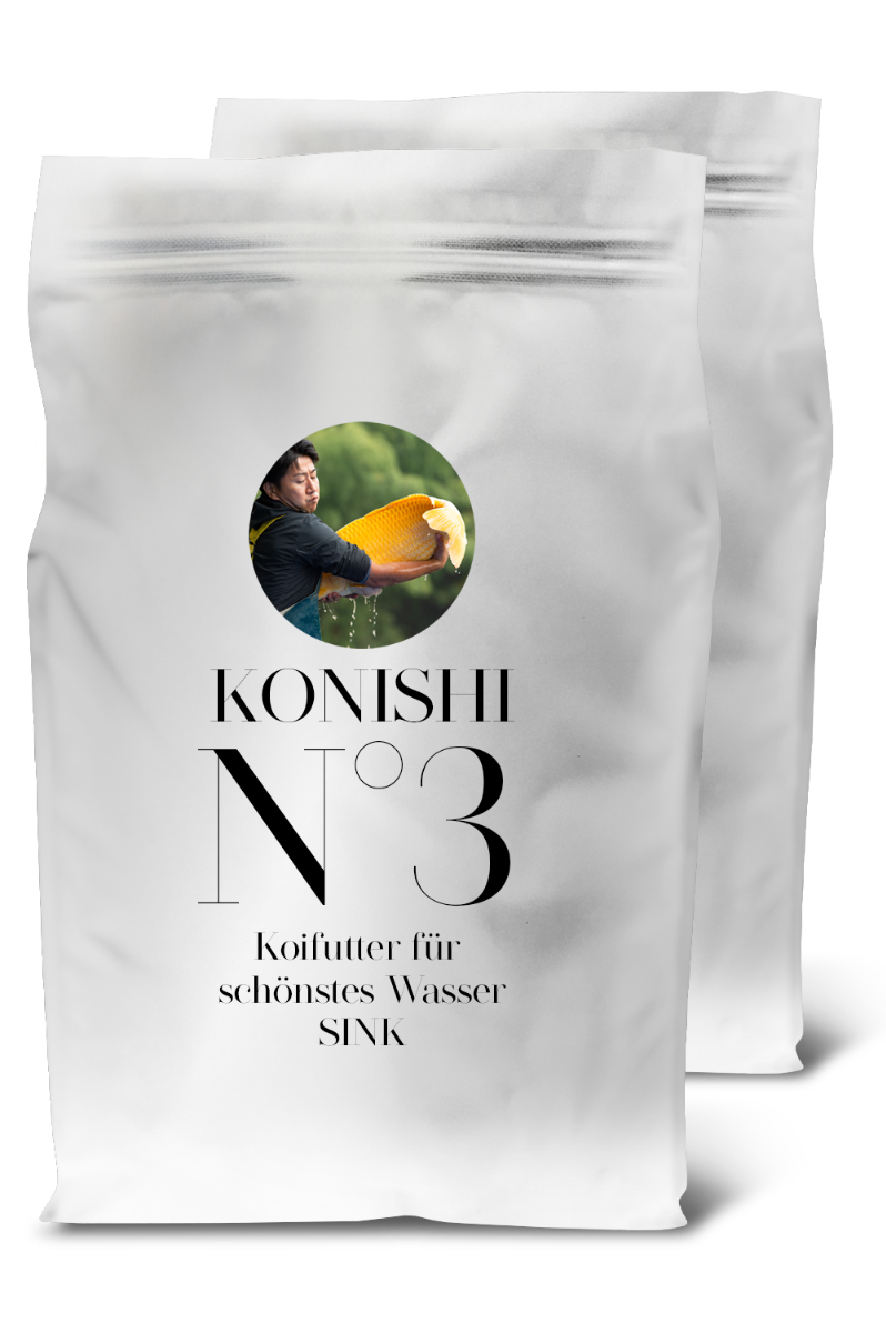 In unserer neuen ausgewogenen Rezeptur reduzieren wir den Proteingehalt von seither 40% auf nunmehr nur noch 30%. Verschiedene Versuche haben gezeigt, dass dies den Stoffwechsel der Koi entlastet, den Appetit stimuliert, die Konzentrationen an Ammonium, Nitrit, Nitrat und Phosphat bedeutend senkt, die Kotausscheidung sichtbar reduziert und das Wachstum und den Volumenaufbau von Koi fördert. Nach der Futterumstellung auf Konishi No. 3 wird sich nach einigen Wochen ein sehr klares und nahezu farbloses Teichwasser zeigen. Dies ist auf die ausgezeichnete Verwertbarkeit und Verdaulichkeit zurückzuführen. Konishi No. 3 richtet sich insbesondere an Koibestände deren Wachstumspotential nahezu ausgeschöpft (Koi ab einer Größe von ca. 70-75 cm) ist oder bei deren Besitzern die absolute Wachstumsgeschwindigkeit nicht im Vordergrund der Koihaltung steht. Dennoch kann mit Konishi No. 3 jeder Koi seine genetisch festgelegte Endgröße erreichen. Es ist ein Alleinfuttermittel und kann ganzjährig über alle Temperaturbereiche gefüttert werden. Jedoch sollte die Futtermenge der Wassertemperatur und der Aktivität der Koi stets angepasst werden.
