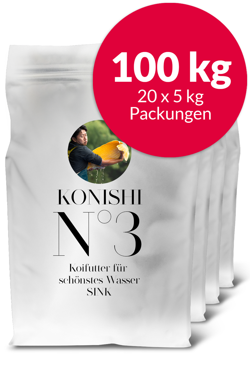 In unserer neuen ausgewogenen Rezeptur reduzieren wir den Proteingehalt von seither 40% auf nunmehr nur noch 30%. Verschiedene Versuche haben gezeigt, dass dies den Stoffwechsel der Koi entlastet, den Appetit stimuliert, die Konzentrationen an Ammonium, Nitrit, Nitrat und Phosphat bedeutend senkt, die Kotausscheidung sichtbar reduziert und das Wachstum und den Volumenaufbau von Koi fördert. Nach der Futterumstellung auf Konishi No. 3 wird sich nach einigen Wochen ein sehr klares und nahezu farbloses Teichwasser zeigen. Dies ist auf die ausgezeichnete Verwertbarkeit und Verdaulichkeit zurückzuführen. Konishi No. 3 richtet sich insbesondere an Koibestände deren Wachstumspotential nahezu ausgeschöpft (Koi ab einer Größe von ca. 70-75 cm) ist oder bei deren Besitzern die absolute Wachstumsgeschwindigkeit nicht im Vordergrund der Koihaltung steht. Dennoch kann mit Konishi No. 3 jeder Koi seine genetisch festgelegte Endgröße erreichen. Es ist ein Alleinfuttermittel und kann ganzjährig über alle Temperaturbereiche gefüttert werden. Jedoch sollte die Futtermenge der Wassertemperatur und der Aktivität der Koi stets angepasst werden. Pelletgröße: 4 - 5 mm, sink.