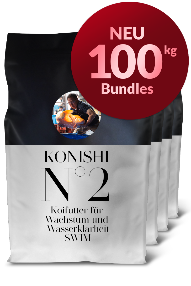 Konishi No. 2 bildet in unserem neuen Futtersortiment den goldenen Mittelweg zwischen maximalem Focus auf Wachstum und optischer Schönheit des Wassers. Auch bei Konishi No. 2 wurde der Proteingehalt von 40% auf 30% reduziert, was sich in einem entlasteten Stoffwechsel, gesteigertem Appetit, Verringerung der Konzentration an Ammonium, Nitrit, Nitrat, Phosphat und einer Reduzierung der Kotausscheidung bemerkbar macht. Somit werden Sie bei der Fütterung von Konishi No. 2 sowohl in den optischen Genuss einer herausragenden Wasserqualität gelangen, als auch Ihren Koi praktisch beim Wachsen zuschauen zu können. Somit empfiehlt sich Konishi No. 2 sowohl an kleine Koi als auch an große, bei denen es um die letzten Zentimeter geht. Es ist ein Alleinfuttermittel und kann ganzjährig über alle Temperaturbereiche gefüttert werden. Jedoch sollte die Futtermenge der Wassertemperatur und der Aktivität der Koi stets angepasst werden